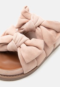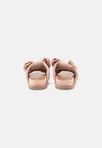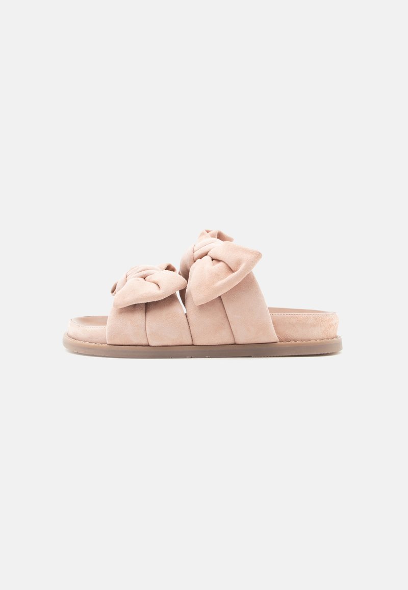 Μαλακό ροζ σανδάλι με μαξιλαρωμένη σόλα και δύο φαρδιές λουρίδες, καθεμία με μεγάλο δεμένο φιόγκο στην κορυφή.