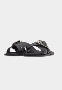 Μαύρο δερμάτινο σανδάλι τύπου slide με μεγάλη ασημένια αγκράφα, τοποθετημένο σε μπεζ υφασμάτινο χαλί κοντά σε ξύλινο στρογγυλό τραπέζι με στοιβαγμένα βιβλία.