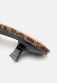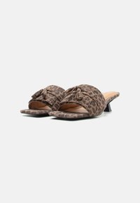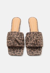 Καφέ mule σανδάλι με λεοπάρ μοτίβο, χαμηλό μαύρο τακούνι και διακοσμητικές φούντες σε φαρδιά λουρίδα.