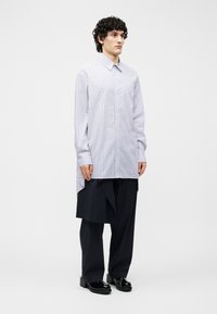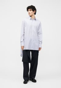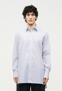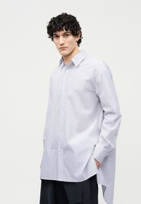 Άνδρας με σγουρά μαλλιά, ντυμένος με μεγάλη πουκαμίσα με λευκές και ανοιχτό μπλε ρίγες και σκούρο παντελόνι, στέκεται μπροστά σε απλό φόντο.