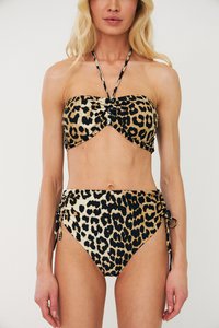 Τρίγωνη μπικίνι κορυφή σε κρεμ απόχρωση με καφέ σχέδιο λεοπάρ. Διαθέτει ριγέ άκρες, ρυθμιζόμενους ιμάντες και κεντρικό διακοσμητικό κούμπωμα.