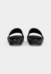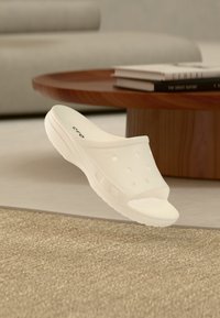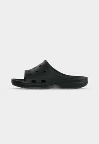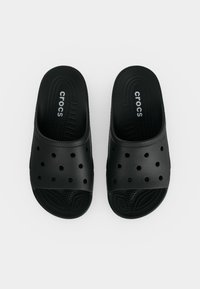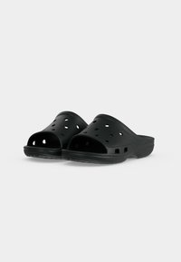 Μαύρα Crocs χωρίς κορδόνια με οπές αερισμού, υφασμένη σόλα, εμφανίζονται εσωτερικά σε χαλί κοντά σε μπεζ καναπέ.