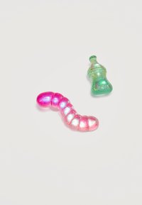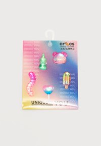 Πέντε πολύχρωμα, διαφανή γοητικά Crocs Jibbitz σε σχήμα μπιμπερό, κεφαλής αρκούδας, σκουληκιού, καρδιάς σε ξυλάκι και γρανίτας σε κάρτα με βαθμιδωτό ροζ-μπλε-κίτρινο χρώμα.