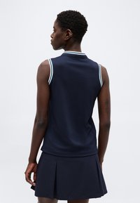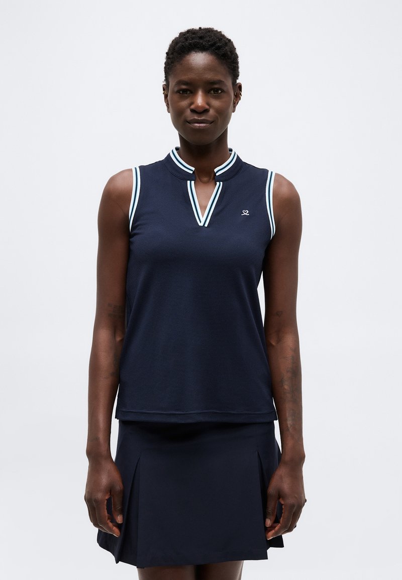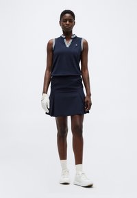 Γυναίκα που φορά αμάνικη μπλούζα σε ναυτικό μπλε με λευκή μπορντούρα και πλισέ φούστα σε ναυτικό μπλε, στέκεται μπροστά σε απλό ανοιχτό γκρι φόντο.