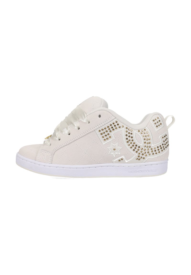 Λευκό αθλητικό παπούτσι με επενδεδυμένη γλώσσα και επίπεδες κορδόνια. Διαθέτει υλικό από σουέντ με υφή, χρυσά τρουκ και σχεδιασμό με μοτίβο στην πλαϊνή πλευρά. Λαστιχένια σόλα.