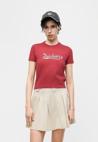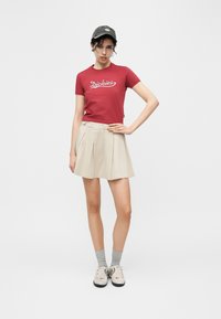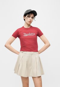 Νέα γυναίκα που φοράει κόκκινο μπλουζάκι "Dickies", μπεζ πλισέ φούστα και μαύρο καπέλο, σηκώνοντας το ένα χέρι κοντά στο μέτωπό της μπροστά σε απλό φόντο.
