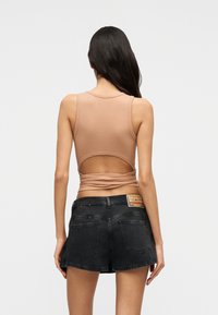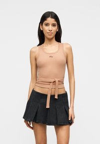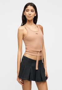 Νέα γυναίκα με μακριά σκούρα μαλλιά, που φοράει ένα μπεζ αμάνικο τοπ με δέσιμο στη μέση και μια μαύρη πλισέ μίνι φούστα, στέκεται μπροστά σε ένα απλό φόντο.