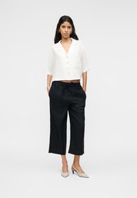 Γυναίκα που φοράει μαύρο φαρδύ cropped παντελόνι με κορδόνι στη μέση και μπεζ παπούτσια με μυτερή μύτη, στέκεται μπροστά σε λευκό απλό φόντο.