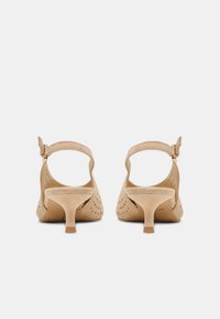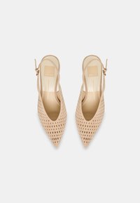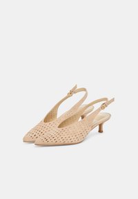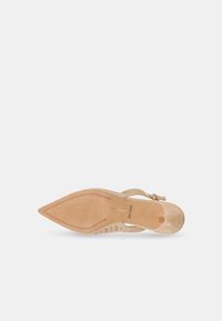 Μπεζ γόβα με μυτερή μύτη και λουράκι πίσω στη φτέρνα, διάτρητο επάνω μέρος, χαμηλό τακούνι στυλ kitten, και ρυθμιζόμενο χρυσό αγκράφα σε λευκό φόντο.