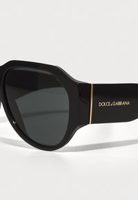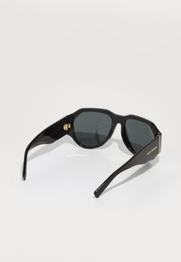 Μαύρα ορθογώνια ηλιακά γυαλιά με χοντρούς γυαλιστερούς σκελετούς, σκούρους γκρίζους φακούς και χρυσή λεπτομέρεια στο πλάι που φέρει το όνομα της μάρκας.