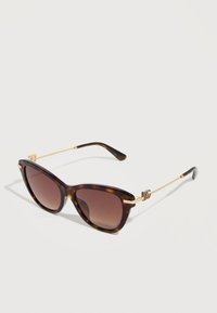 Γυαλιά ηλίου σε σχήμα γάτας με καφέ βαθμιδωτούς φακούς και λεπτούς χρυσούς βραχίονες με ένα μικρό διακοσμητικό έμβλημα κοντά στις μεντεσέδες.