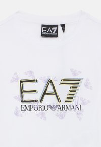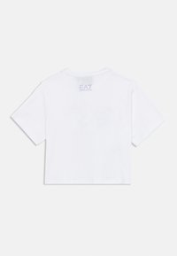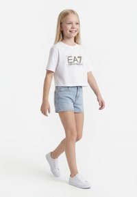 Νεαρό κορίτσι περπατά, φοράει λευκό t-shirt EA7 Emporio Armani, ανοιχτό μπλε τζιν σορτς και λευκά αθλητικά παπούτσια, χαμογελάει και κοιτά μπροστά.