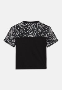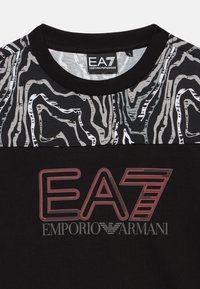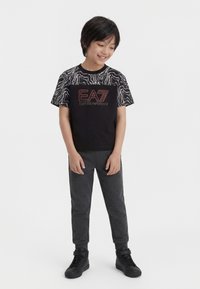 Αγόρι που φοράει μαύρο και γκρι t-shirt EA7 Emporio Armani με μοτίβο στα μανίκια, σκούρο παντελόνι jogger και μαύρα ψηλά αθλητικά παπούτσια, στέκεται και χαμογελάει.