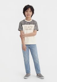 Αγόρι με μαύρα μαλλιά στέκεται φορώντας μια μπεζ μπλούζα EA7 με αμάνικα με σχέδια, ανοιχτόχρωμα μπλε τζιν και γκρι παπούτσια slip-on σε λευκό φόντο.