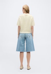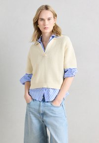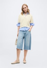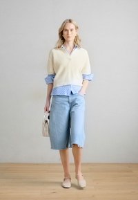 Νεαρή γυναίκα που φοράει πλεκτό πουλόβερ σε κρεμ χρώμα με κοντά μανίκια πάνω από μπλε ριγέ πουκάμισο με τα μανίκια ανασηκωμένα και ανοιχτόχρωμα τζιν με φαρδιές παντελόνες, στέκεται με τα χέρια στις τσέπες.