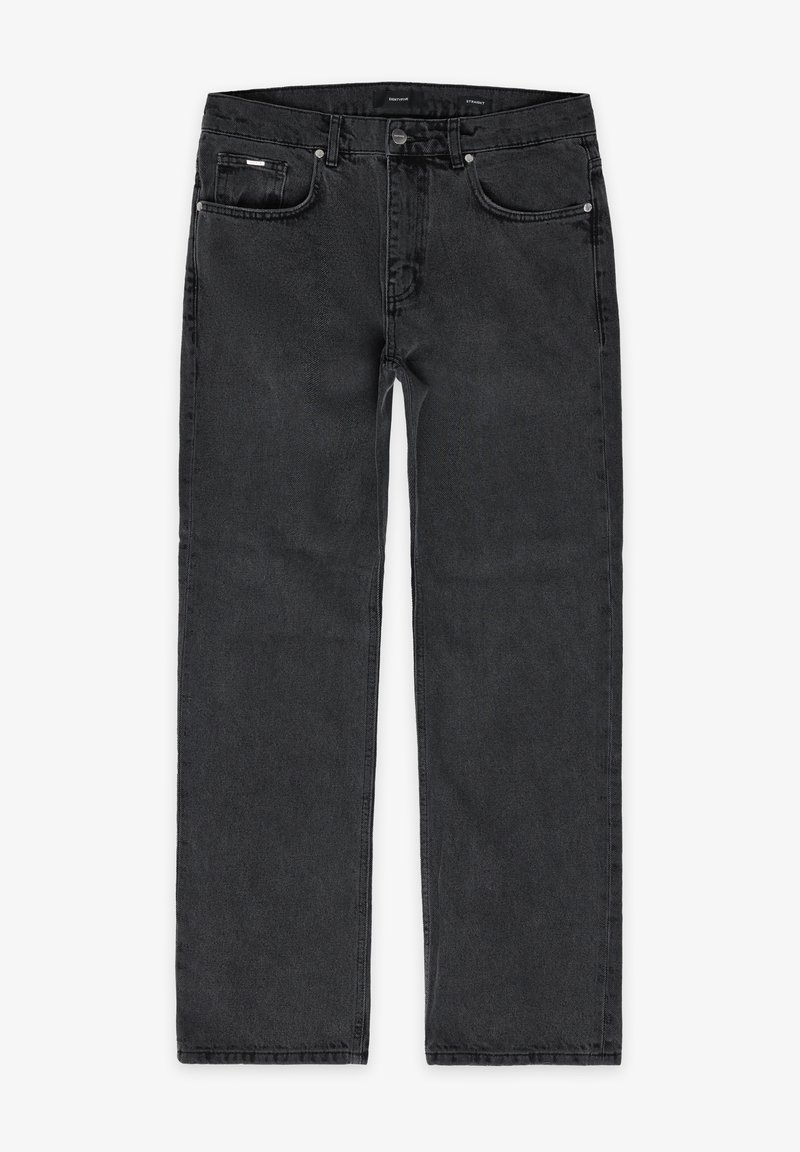 Μαύρα τζιν παντελόνια με σχέδιο ίσιου ποδιού, πέντε τσέπες και κλείσιμο με κουμπί. Διαθέτουν μια διακριτική υφή και μινιμαλιστικό στυλ.