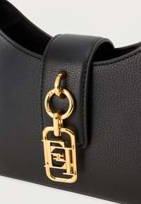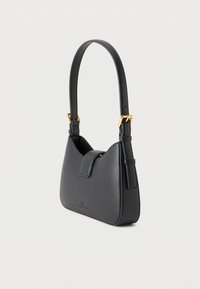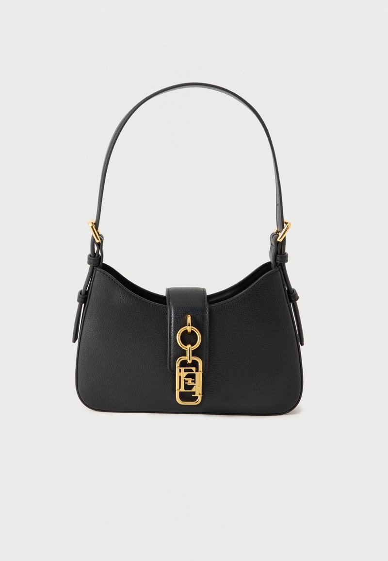 Μαύρη δερμάτινη τσάντα ώμου με χρυσαφί αγκράφα και εξαρτήματα, διαθέτει έναν ιμάντα και κλείσιμο με μπροστινό καπάκι.
