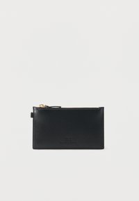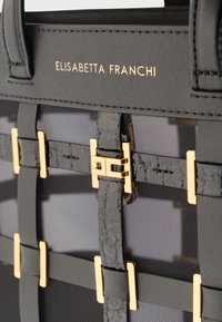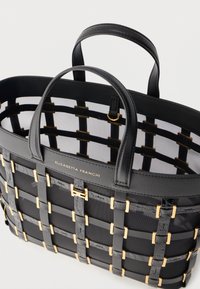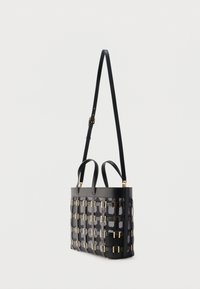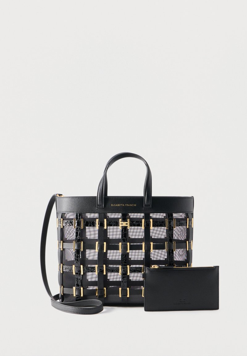 Μαύρη δερμάτινη τσάντα ώμου με σχέδιο πλέγματος και χρυσά αγκράφες, συνοδευόμενη από μια ταιριαστή μαύρη τσάντα με φερμουάρ, σε λευκό φόντο.