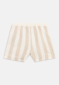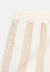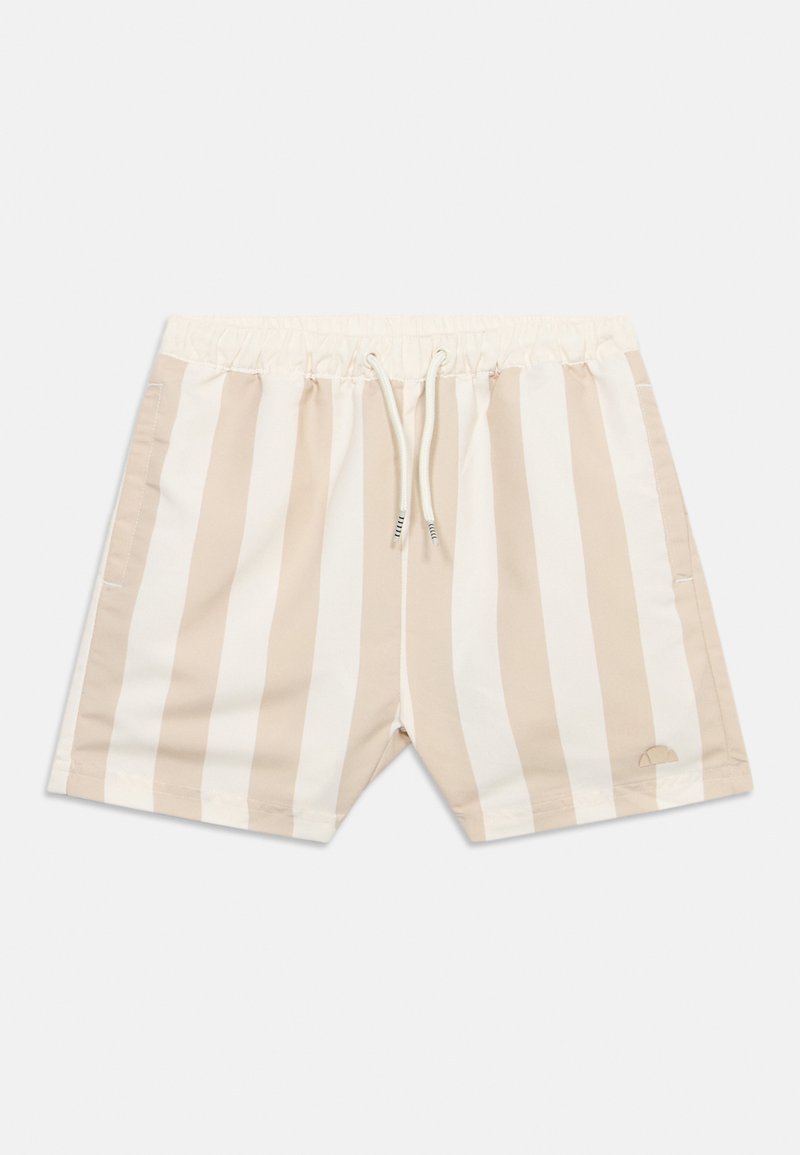 Ανδρικό μαγιό βερμούδα με κάθετες μπεζ και λευκές ρίγες, ελαστική μέση και λευκό κορδόνι.