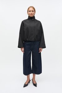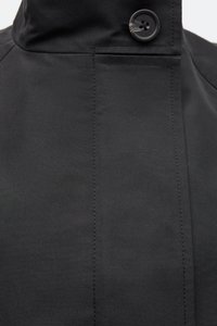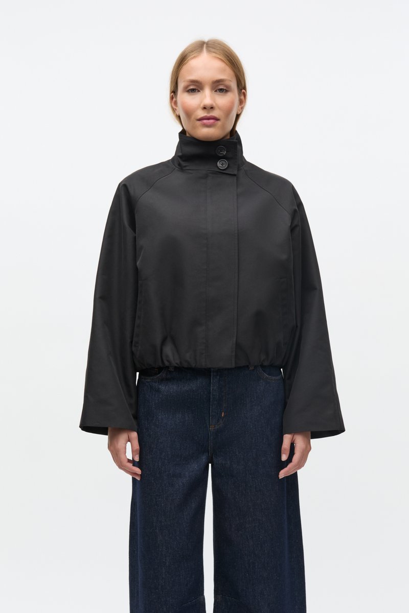 Μαύρο κοντό μπουφάν με ψηλό γιακά, κούμπωμα με κουμπιά και φαρδιά μανίκια. Το ύφασμα φαίνεται λείο και ανθεκτικό στις καιρικές συνθήκες. Φοριέται με σκούρο τζιν.