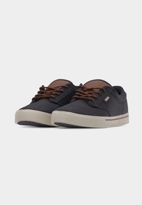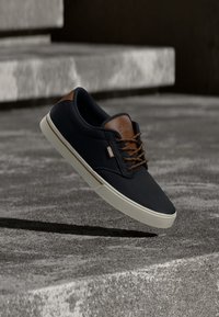 Μαύρο αθλητικό παπούτσι χαμηλού τύπου με καφέ κορδόνια και λεπτομέρειες στη φτέρνα, λευκή σόλα, να αιωρείται πάνω από σκιασμένα σκάλες από σκυρόδεμα.