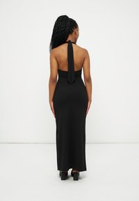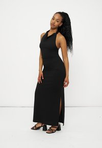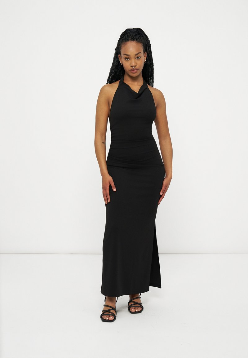 Γυναίκα με μακριά πλεξούδα που φοράει μαύρο αμάνικο φόρεμα με halter neck και πλαϊνή σκίσιμο, καθώς και μαύρα σανδάλια με λουριά, στέκεται μπροστά σε λευκό φόντο.