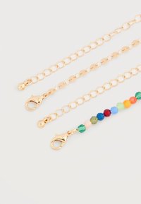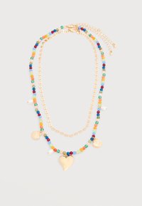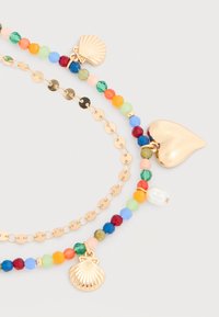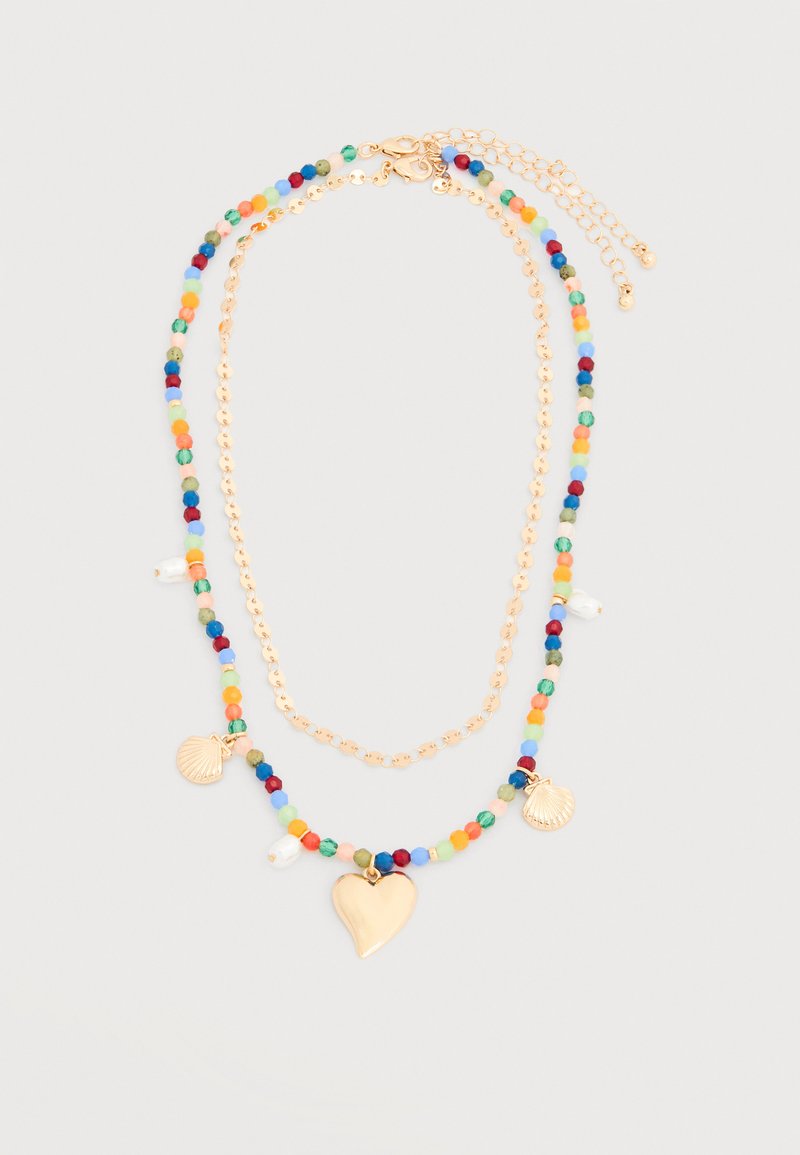 Κολιέ διπλής στρώσης με χρυσή αλυσίδα και πολύχρωμο κολιέ από χάντρες, με χρυσή καρδιά, δύο κοχύλια και μικρές λευκές χάντρες.