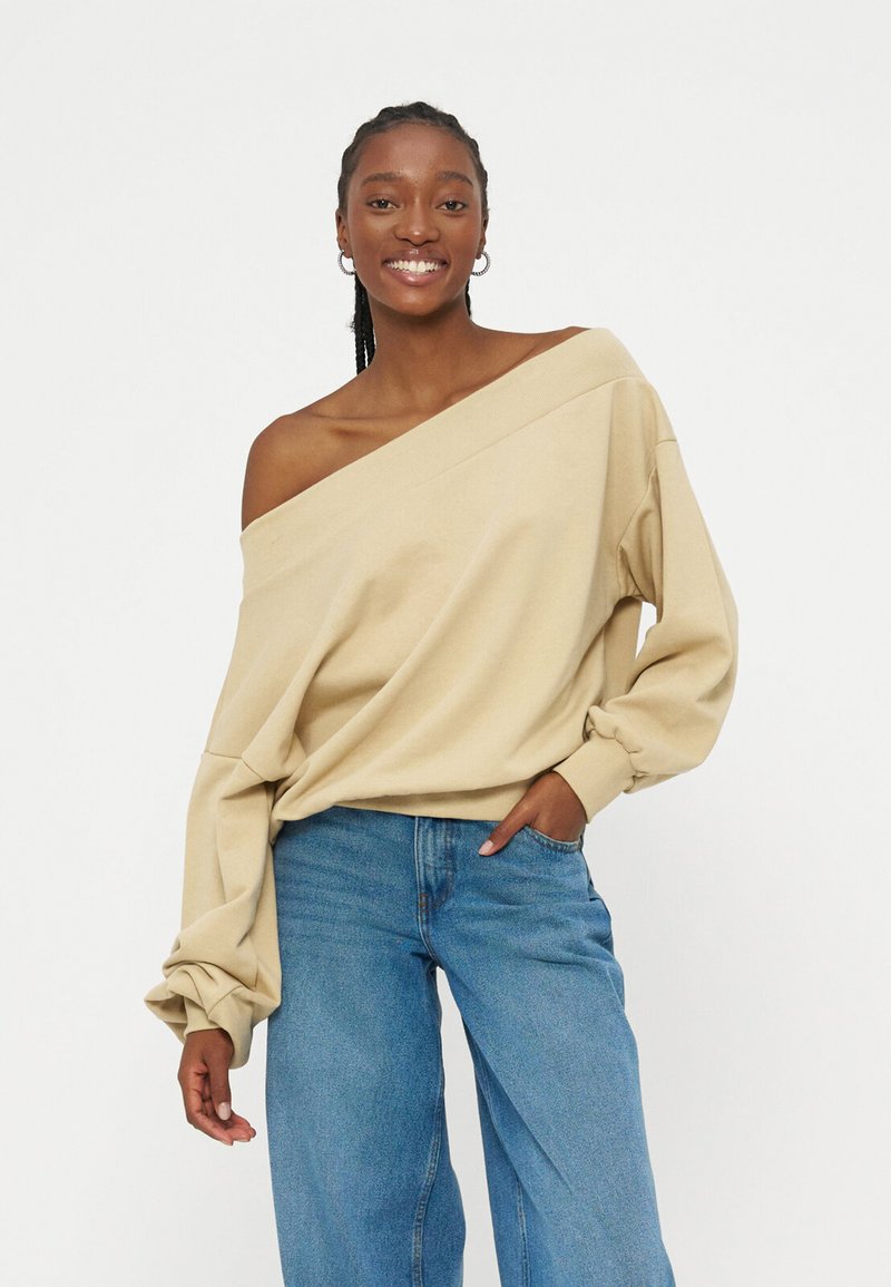 Χαμογελαστή γυναίκα με πλεκτά μαλλιά φοράει μπεζ φούτερ με ακάλυπτους ώμους και μπλε τζιν, στέκεται με το ένα χέρι στην τσέπη σε λευκό φόντο.