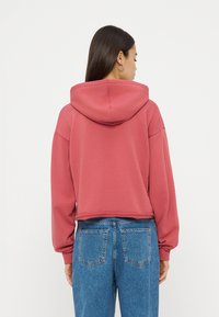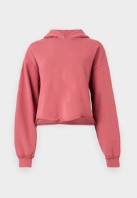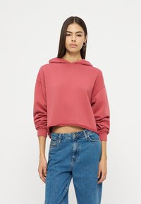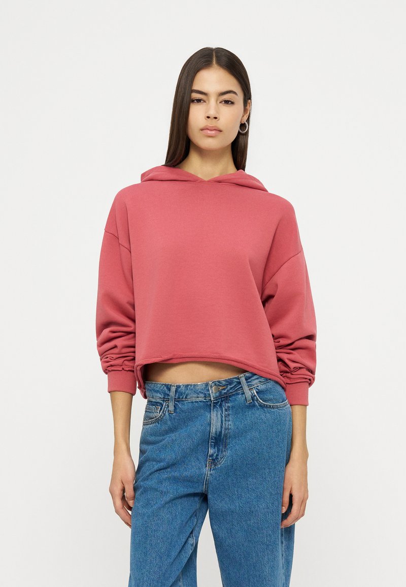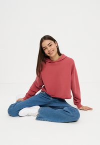Γυναίκα που φοράει ροζ cropped φούτερ με μακριά μανίκια και μπλε ψηλόμεσο τζιν, στέκεται μπροστά σε λευκό φόντο.