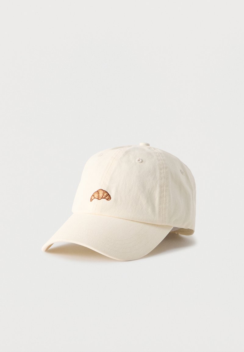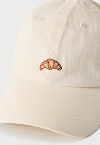 Εκρού μπέιζμπολ καπέλο με ένα μικρό κεντημένο καφέ κρουασάν στο μπροστινό κέντρο, εμφανίζεται σε απλό φόντο.