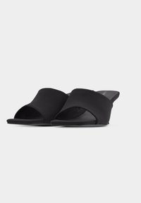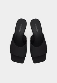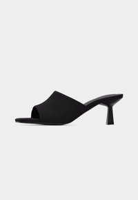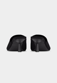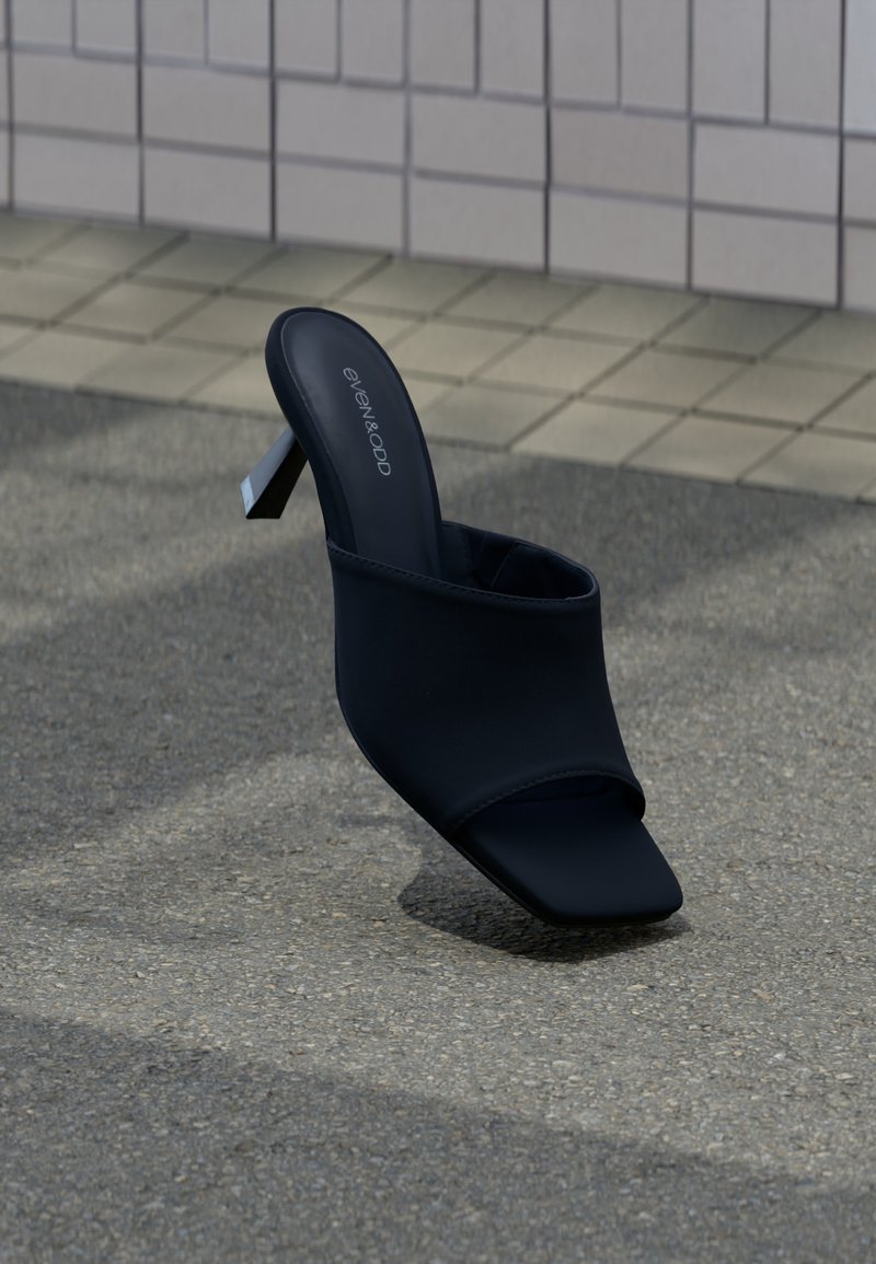 Μαύρο mule ανοιχτής μύτης με χοντρό τακούνι και τετράγωνη μύτη, με την επωνυμία «EVEN&ODD», τοποθετημένο σε γκρι πλακόστρωτο κοντά σε τοίχο με πλακάκια.