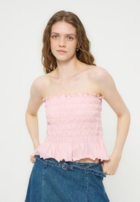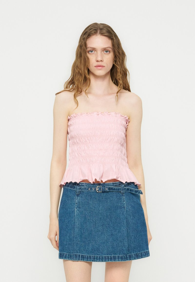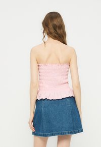 Νεαρή γυναίκα με μακριά κυματιστά μαλλιά που φοράει ένα ροζ κορμάκι χωρίς τιράντες και μια μπλε τζιν μίνι φούστα με ζώνη μπροστά από ένα απλό φόντο.