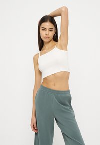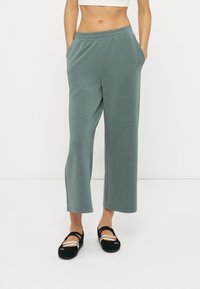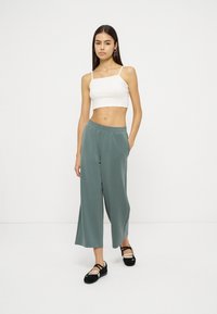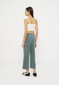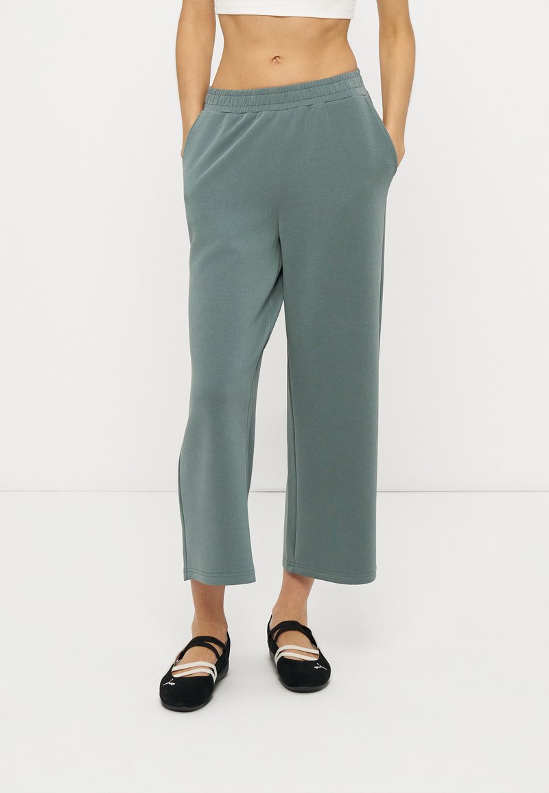Γυναίκα που φοράει πράσινη σκούρα φαρδιά φόρμα με κοντό μήκος και ελαστική μέση, μαζί με μαύρα μπαλαρίνα παπούτσια με λουράκια, σε λευκό φόντο.