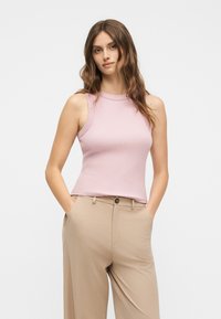 Γυναίκα που φοράει μπεζ φαρδιά παντελόνια, ανοιχτό ροζ αμάνικο τοπ και κρεμ αθλητικά παπούτσια, στέκεται μπροστά σε λευκό φόντο.