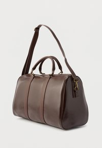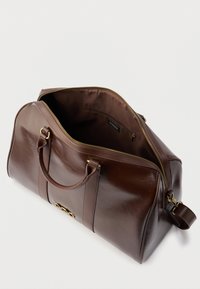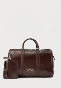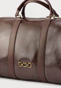 Σκούρο καφέ δερμάτινη τσάντα duffel με διπλές λαβές, έμβλημα αλυσίδας σε χρυσό και συνδεδεμένη δερμάτινη ετικέτα αποσκευών και λουράκι στο ίδιο χρώμα.