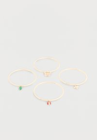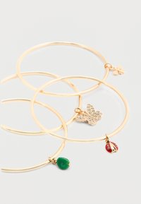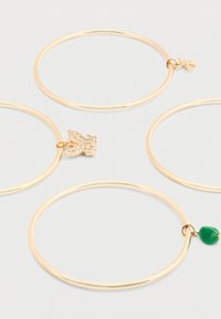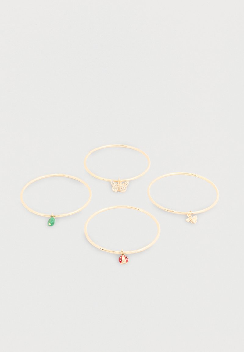 Τέσσερα λεπτά χρυσά βραχιόλια με μικρά κρεμαστά γούρια: μια πράσινη σταγόνα, μια πεταλούδα με διαυγή πετράδια, μια κόκκινη πασχαλίτσα και μια χρυσή μέλισσα.