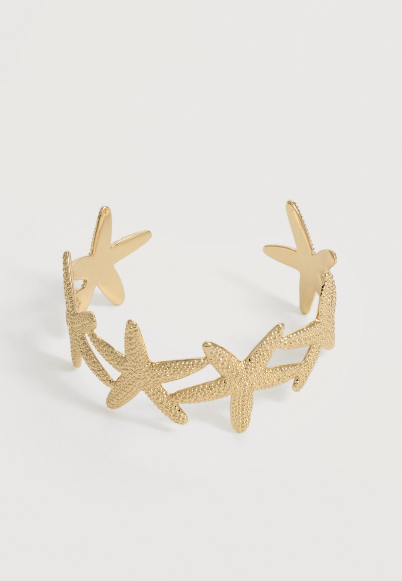 Χρυσό ανοιχτό βραχιόλι με υφή αστερία συνδεδεμένος σε συνεχή αλυσίδα σε λευκό φόντο.