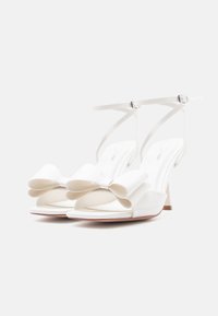 Λευκό σανδάλι με ψηλό τακούνι, λουρί στον αστράγαλο, ανοιχτή μύτη και διακοσμητικό φιόγκο στο μπροστινό λουρί πάνω σε απλό φόντο.