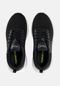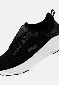 Μαύρο αθλητικό παπούτσι με επάνω μέρος από αναπνεύσιμο πλέγμα, κλείσιμο με κορδόνια, λευκή μεσαία σόλα και μαύρη εξωτερική σόλα. Φέρει το λογότυπο της Fila στο πλάι.
