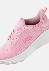 Αθλητικό παπούτσι ανοιχτό ροζ με υφή από διχτυωτό επάνω μέρος. Λευκή ενδιάμεση σόλα και εξωτερική σόλα, με ροζ λεπτομέρειες και έντονο λογότυπο Fila στο πλάι.