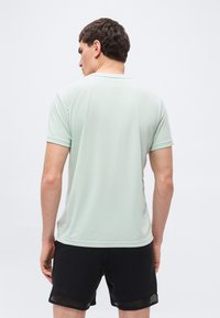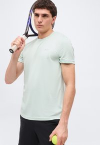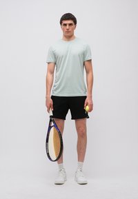 Άνδρας που φοράει κοντομάνικο αθλητικό μπλουζάκι FILA ανοιχτού πράσινου χρώματος και μαύρο σορτς, στέκεται μπροστά σε ουδέτερο φωτεινό φόντο.