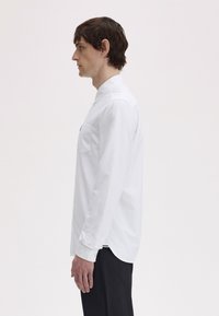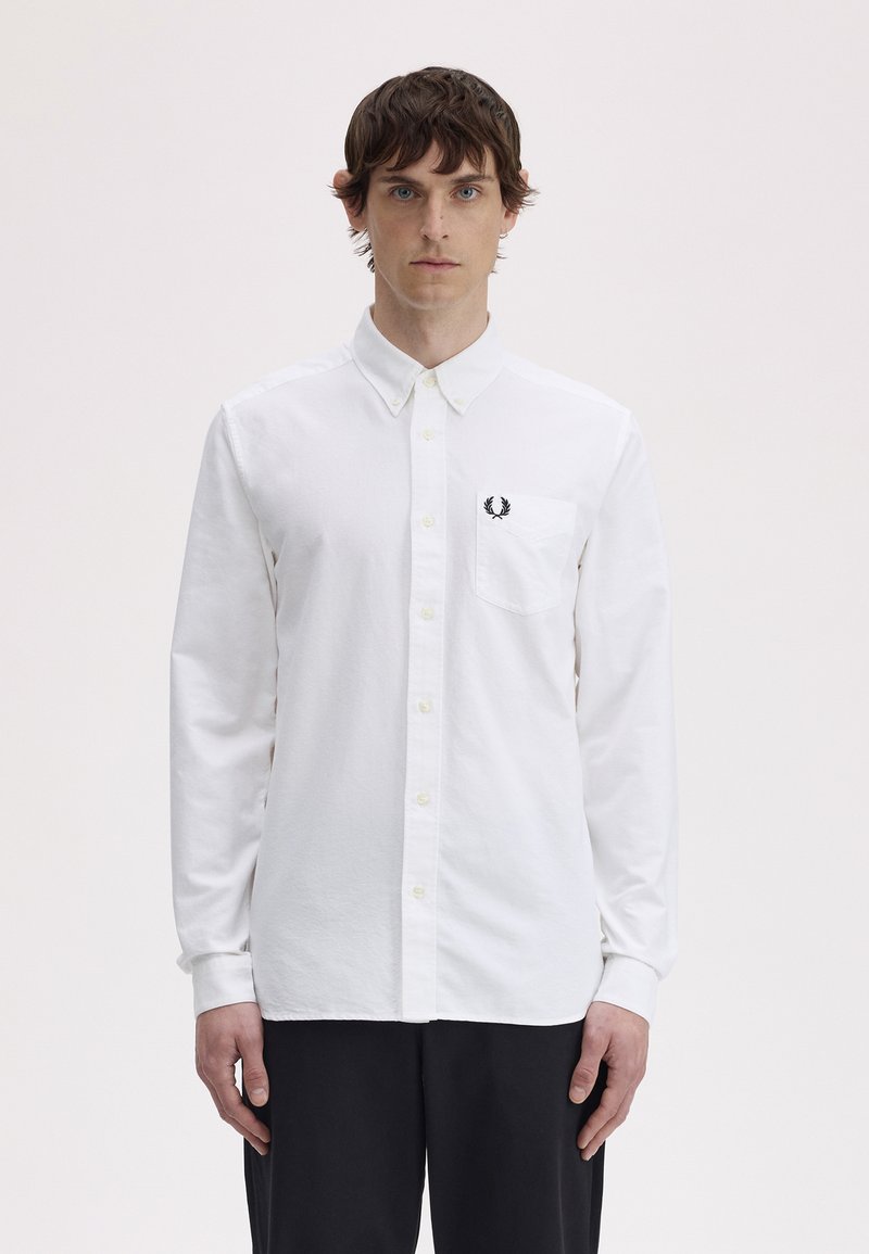 Άνδρας που φοράει λευκό πουκάμισο με κουμπιά, τσεπάκι στο στήθος και μαύρο λογότυπο δάφνης, στέκεται μπροστά σε απλό φωτεινό φόντο.