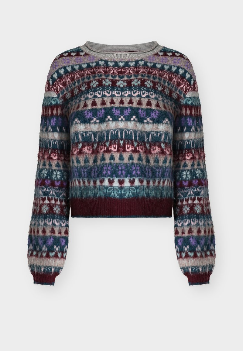 Πολύχρωμο πλεκτό πουλόβερ με στρογγυλή λαιμόκοψη, που διαθέτει οριζόντια γεωμετρικά και ελαφριά σχέδια σε αποχρώσεις του βουργουνδίας, τιρκουάζ, γκρι και μοβ.