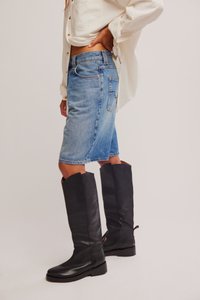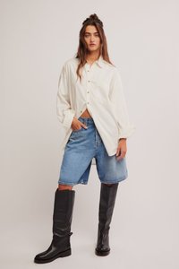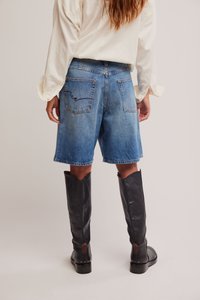 Χέρια στις τσέπες ενός ζευγαριού φαρδιών μπλε τζιν σορτς συνδυασμένων με ψηλές μαύρες δερμάτινες μπότες και ένα σχεδόν λευκό πουκάμισο με κουμπιά.