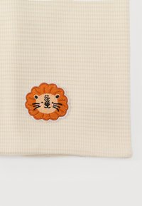 Κρεμ ορθογώνιο ύφασμα πλεκτό, με μικρό κεντημένο πορτοκαλί πρόσωπο λιονταριού κοντά σε μια γωνία.