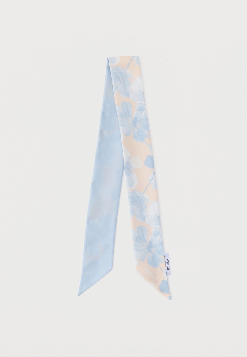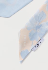 Φουλάρι από μετάξι σε ανοιχτό γαλάζιο και μπεζ χρώμα με floral σχέδιο και μυτερά άκρα, με ετικέτα της μάρκας Furla.