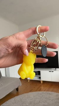 Κίτρινο φυλαχτό σε σχήμα αρκούδας από ζελέ, προσαρτημένο σε χρυσό μπρελόκ με κούμπωμα σε λευκό φόντο.