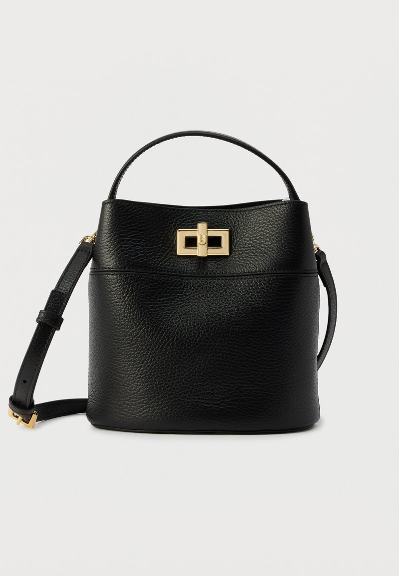 Μαύρη δερμάτινη τσάντα τύπου κουβά με υφή, χρυσό ορθογώνιο κούμπωμα με περιστρεφόμενο κλειδί, λαβή στο πάνω μέρος και ρυθμιζόμενο λουράκι ώμου.