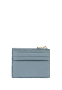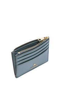 Ανοιχτό μπλε δερμάτινη θήκη για κάρτες με χρυσά μεταλλικά στοιχεία, που διαθέτει πολλαπλές θήκες για κάρτες και μια θήκη με φερμουάρ. Το λογότυπο του brand εμφανίζεται με έντονο τρόπο.