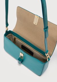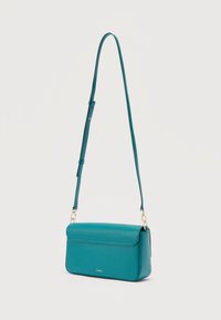 Τσαντάκι ώμου από δέρμα σε πετρόλ απόχρωση με μπροστινό καπάκι, κούμπωμα σε σκούρο πετρόλ και ρυθμιζόμενο ιμάντα με μεταλλικά στοιχεία σε χρυσή απόχρωση σε λευκό φόντο.